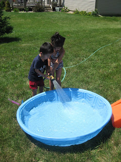 The kids are fighting over the hose in between sliding down the slide into the little pool. In a few weeks we will have our bigger pool blown up as we celebrate C's 6th birthday with her friends here. The pool has a small leak in it, so we thought we would wait to pull it out until her birthday party.